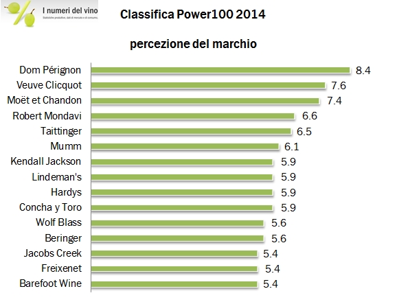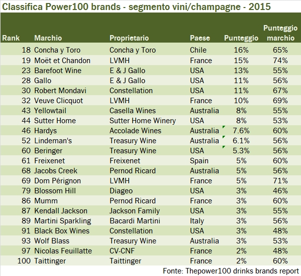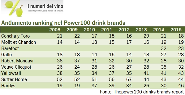 - Il leader è Concha y Toro, al 18esimo posto con un guadagno di tre posizioni sullo scorso anno ma, badate, comunque sotto il livello più elevato raggiunto nel 2012, quando fu il 16esimo marchio. Lo Champagne Moet&Chandon è stabile al 19esimo posto, mentre il terzo marchio diventa Barefoot, al 23esimo posto, che supera E&J Gallo (che la possiede), meno una posizione al 28esimo posto. Al 30esimo posto Robert Mondavi di Constellation Brands, che perde un paio di posizioni.