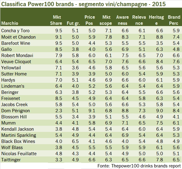 - Cosa fa vincere Concha y Toro? Le alte quote di mercato, perchè se guardiamo ai punteggi di posizionamento di prezzo, tradizione del marchio e sua celebrità, Moet & Chandon resta avanti.