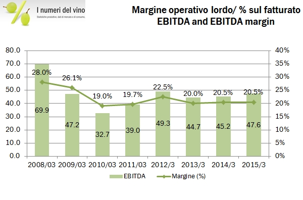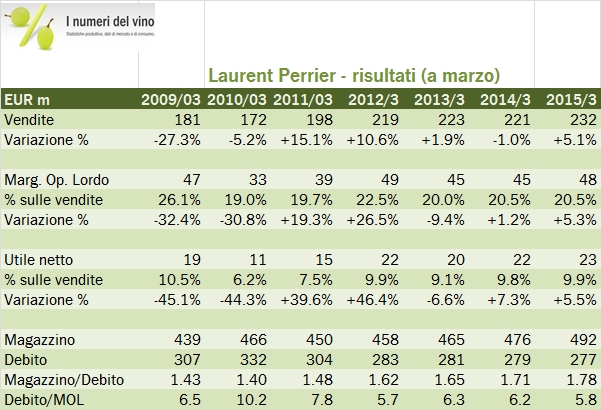 Laurent Perrier ha chiuso il 2014/15 con buoni risultati (vendite in moderata crescita e margini stabili), soprattutto se confrontati con quelli delle altre due piccolo quotate, in particolare nel mercato domestico. Non solo. Sta investendo pesantemente: nella struttura industriale, con il nuovo sito produttivo di Tours-sur-Marne (previsto iniziare l’attività durante il 2017), nella struttura commerciale, con l’apertura di Laurent Perrier Italia, nell’integrazione a monte, con l’acquisizione del négociant François Daumale che aumenterà la visibilità sugli acquisti del gruppo. Infine, ha anche cambiato il top management con la nomina di un nuovo amministratore delegato. Come vi dicevo, i numeri che tra breve scorriamo nel particolare sono buoni: le vendite crescono del 5%, con un piccolo aiuto dei cambi (+2%) ma soprattutto con un incremento del 2.6% del prezzo mix (il modo migliore per crescere in un segmento come lo Champagne dove i volumi sono sostanzialmente cappati); i margini sono stabili, come l’indebitamento, nel quadro di una politica di dividendi costante. Sebbene siamo lontani dai risultati di picco del 2007-08, LP è certamente la meglio posizionata tra le quotate, con un incremento del 3% dell’utile operativo contro un calo del 16% per Lanson e del 7% per Vranken (-5% per la divisione vini/champagne di LVMH).