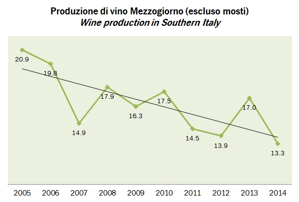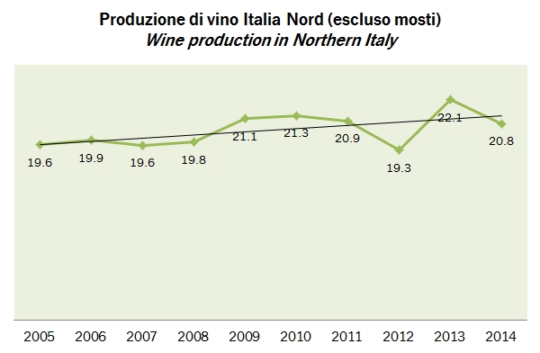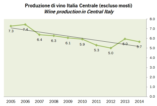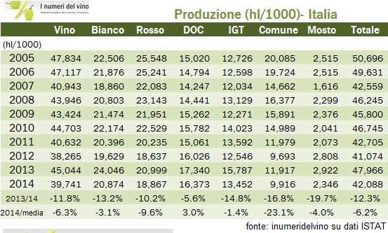 - La produzione di vini DOC di 16.3 milioni di ettolitri cala del 6% ma è del 3% superiore alla media, mentre i vini IGT subiscono una flessione del 15% e si riallineano alle produzioni recenti. Il calo strutturale dei vini da tavola invece continua, con una riduzione del 17% nel 2014: con 9.9 milioni di ettolitri sono il 23% sotto la media del quinquennio.