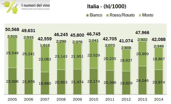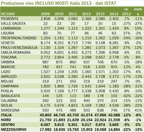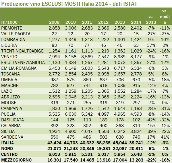Spero con questo post di darvi la migliore fotografia possibile della produzione di vino italiana nel 2014, dato che il sito dell’ISTAT oltre a rilevare i dati con colpevole ritardo (23 luglio 2015) fa molta confusione. Tipo? Confrontando nel corso degli anni dati che includono i mosti o meno, sommando per due volte la produzione di Trento e Bolzano che (maledizione) sono riprodotte in tutte le tabelle regionali, dimenticandosi di correggere le produzione DOC siciliane per il passaggio da IGT a DOC della denominazione Sicilia, mettendo dati sulle superfici vitate che sono francamente inpubblicabili. Fine del piagnisteo, però sarebbe necessario che Unione Italiana Vini o Federvini suoni la campanella e metta ordine tra ISTAT, ISMEA, INEA, MIPAAF, Federdoc e compagnia.