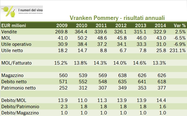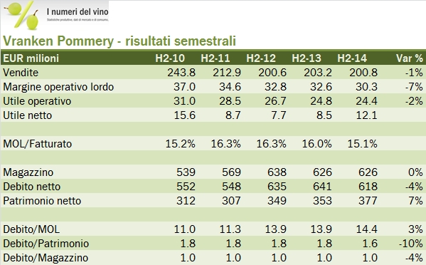 Anche per Vranken Pommery il 2014 non è stato un anno generoso. Il business, più diversificato di quello di Lanson, ha subito una minore pressione sui margini ma il tema della debolezza della Francia ricorre anche in questo caso. Vranken ha ristrutturato la sua attività nei vini fermi, apportandola a una JV, con un’operazione neutra sul fatturato ma leggermente negativa sui margini. Senza quella, i numeri sarebbero stati stabili. Il 2014 è stato dunque un anno di “riordino” dell’attività e di leggero calo del debito, che resta una priorità anche per il 2015, quando i numeri saranno diversi (meno fatturato e meno margini) per via del trasferimento di parte dell’attività alla joint venture. Nei primi 3 mesi dle 2015 le vendite infatti calano da 54 a 46 milioni, ma sarebbero cresciute del 3% a perimetro comparabile, mentre le vendite dei vini della società Listel, apportata nella joint venture, sono cresciute del 9%. Andiamo ad analizzare qualche numero insieme.