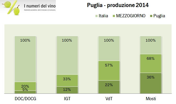 • Mi sembra invece più interessante richiamare la vostra attenzione su una nuova serie di grafici che inserisco, dove cerco di rappresentare la rilevanza della regione nell’ambito nazionale. Nel caso della Puglia, la regione rappresenta il 13% della produzione di vino e mosti, il 10% della produzione di vino bianco, il 14% del vino rosso e il 36% dei mosti. Dal punto di vista delle categorie qualitative, in Puglia si produce il 5% del vino DOC italiano, il 12% del vino IGT e il 22% del vino da tavola nazionale.