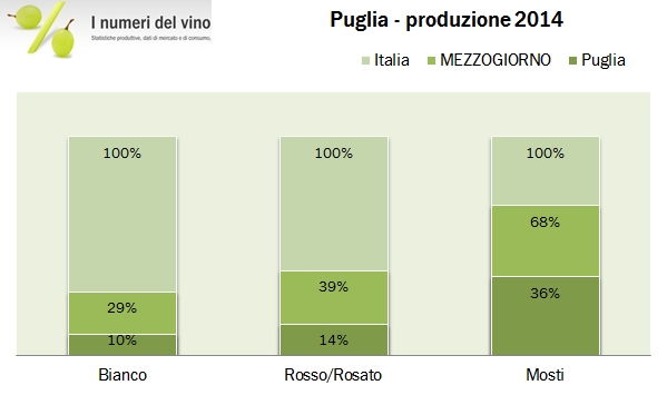 • Come nel resto del Mezzogiorno i vini bianchi hanno sofferto più dei vini rossi. La produzione 2014 scende a meno di 2 milioni di ettolitri, uno dei dati più bassi degli ultimi anni, -4% contro il 2013 e -14% contro la media storica.