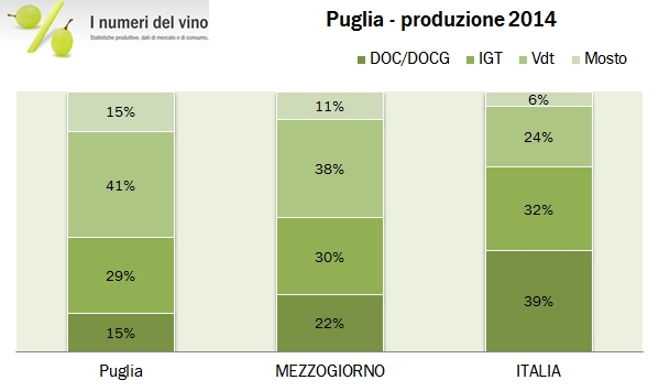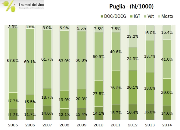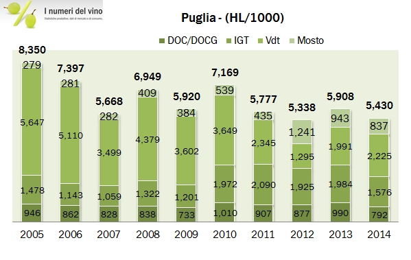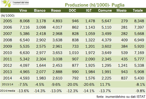 Con il commento dei dati della Puglia entriamo nel campo minato che si presenta nelle regioni in cui ISTAT ha fatto confusione tra i dati provinciali con dentro i mosti o meno. Ciò significa che se i dati regionali sono consistenti nel tempo, quelli provinciali non lo sono: i dati 2014 includono i mosti, come quelli del 2009 e 2010, mentre il 2011-12-13 non li includono. E per la Pugllia non stiamo parlando dati marginali, ma di 800mila ettolitri e più, su una produzione totale di 5.4 milioni di ettolitri. E’ un peccato, soprattutto perchè stiamo parlando di una regione che rappresenta il 12% della produzione di vino 2014 e circa un terzo di quella del Mezzogiorno. Fatta questa premessa, passiamo ai numeri. Come vi anticipavo, la produzione 2014 è calata a 5.4 milioni di ettolitri incluso mosti e 4.6 milioni di ettolitri se li escludiamo. In entrambi i casi si tratta di un calo dell’8%, quindi inferiore a quello più marcato del Mezzogiorno, -22% e della produzione nazionale, -12%. Andiamo a commentare in dettaglio.