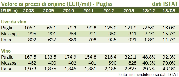 • Chiudiamo con il valore della produzione vinicola, che nel 2013 è esploso letteralmente per la Puglia, a 314 milioni di euro, +49% rispetto al 2012 e +92% se confrontato al dato di 5 anni fa, il 2008. In confronto, il Mezzogiorno è cresciuto nel quinquennio dell’80% e l’Italia del 43%. Quindi, decisamente meglio…