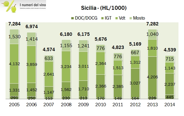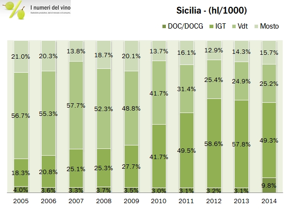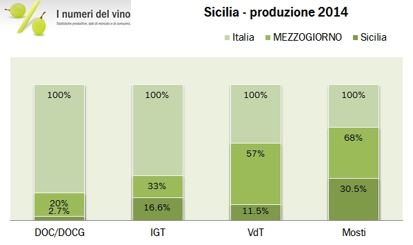 • Nel panorama nazionale la Sicilia continua a ricoprire un ruolo importante, rappresentando l’11% della produzione (circa un terzo di quella del Mezzogiorno). All’interno delle categorie, in Sicilia si produce il 30% del mosto italiano del 2014, il 9% dei vini rossi e il 10% dei vini rosati, il 12% dei vini da tavola e il 16% dei vini IGT.