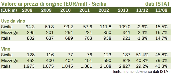 • L’economia vinicola siciliana ha visto un importante sviluppo nel 2013, con un incremento del 51% del valore della produzione di vino, a 187 milioni di euro, contro +40% per il Mezzogiorno e +30% per l’Italia. La dinamica sui 5 anni, +45% cumulata, resta invece allineata alla media nazionale.
