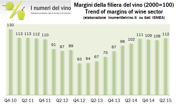 • In questo quadro i margini dell’industria vinicola si espandono dopo un paio di trimestri in calo. L’indice del livello dei margini è 112, rispetto a 108 del primo trimestre e 102 di un anno fa. Ciò significa che anche il 2015 si prevede un anno in cui i margini delle aziende si andranno ad espandere (soprattutto quelli che esportano!).