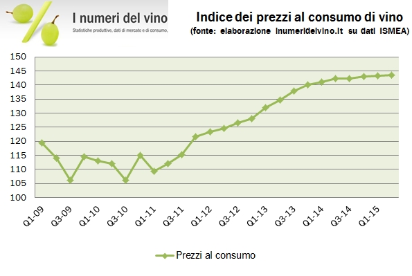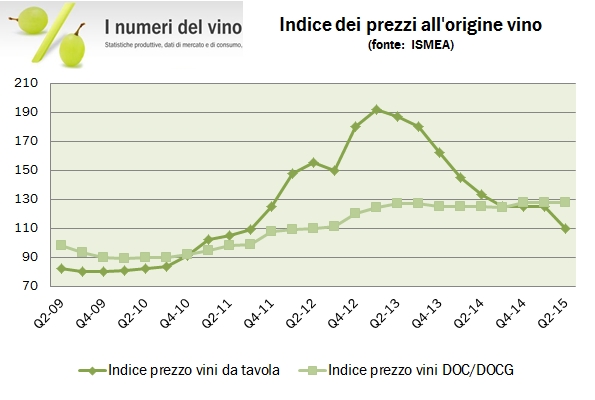 • Sono invece crollati i prezzi dei vini da tavola a causa della forte concorrenza dei vini esteri (spagnoli), ma anche penso dalle previsioni incoraggianti sulla vendemmia 2015. Il loro prezzo è calato del 18% rispetto al secondo trimestre 2014 e del 12% rispetto a marzo 2015, portando l’indice del prezzo a un valore di 110, quindi ben al di sotto (proporzionalmente) al valore dei vini di qualità.