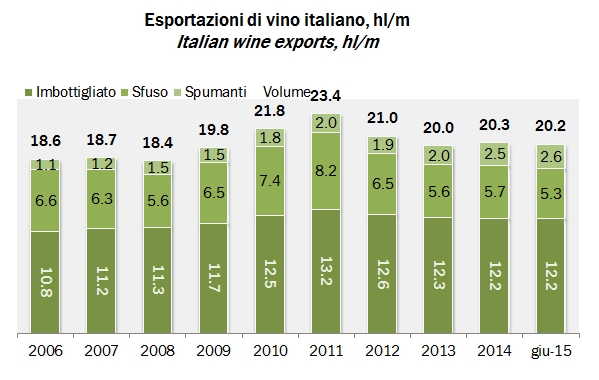 - L’export nel primo semestre tocca i 2.52 miliardi di euro, +6.5%, per un volume di 9.7 milioni di ettolitri, -1.6%. Se guardiamo invece i dati in ragione d’anno, come li trovate nei due grafici allegati, le esportazioni hanno toccato 5.23 miliardi di euro (mooolto lontani dall’obiettivo di 7 miliardi di Renzi, sia in valore assoluto che in velocità di crociera), per un volume di di 20.2 milioni di ettoitri (questa volta stabile rispetto ai 12 mesi terminati a giugno 2014).