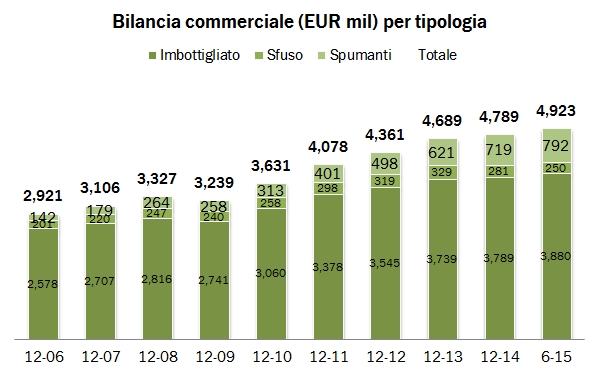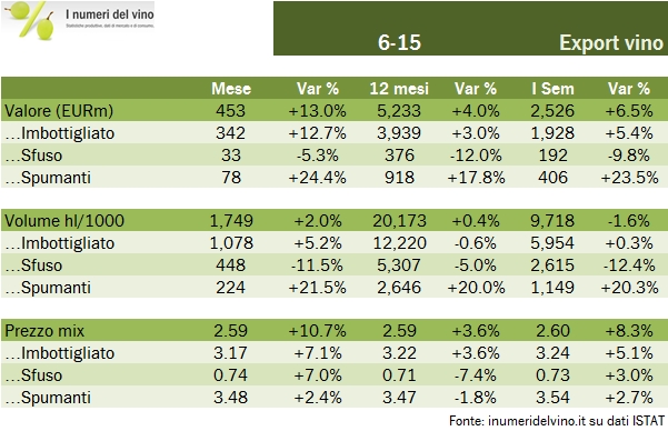 Nel primo semestre le esportazioni italiane di vino chiudono a +6.5%, con un colpo di coda nel mese di giugno che le porta praticamente alla medesima velocità di quelle francesi (+6.2% come abbiamo commentato qualche giorno fa), e un filo davanti a quelle spagnole, che come vedremo a fine mese sono cresciute del 5.9%. Giugno è stato un mese eccellente (+13%) in un semestre molto ondivago, caratterizzato da una cattiva partenza (gennaio -6%) cui hanno fatto seguito dati molto positivi in Marzo, Aprile e giugno appunto. Nonostante una decisa ripresa delle importazioni (che discuteremo tra qualche giorno), anche la bilancia commerciale continua a progredire. Siamo a 4.92 miliardi di euro, abbiamo guadagnato 180 milioni di euro negli ultimi 12 mesi, soprattutto negli ultimi 6 mesi (130 milioni). Neanche a dirlo, le esportazioni sono trainate dagli spumanti, quelli DOP, che continuano a viaggiare a un ritmo superiore al 20%. Ma andiamo ad analizzare i numeri in dettaglio.