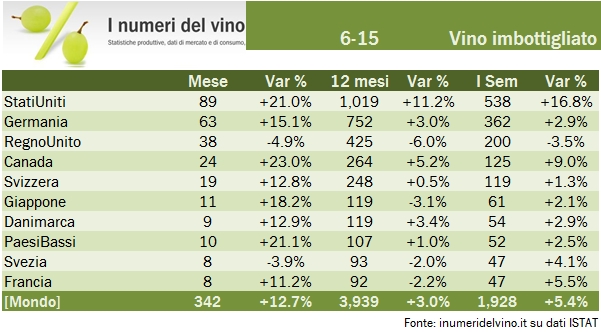 - Nel segmento dei vini imbottigliati, gli Stati Uniti sono ormai diventati il mercato chiave, con oltre 1 miliardo di euro di valore nei 12 mesi e 538 negli ultimi 6 mesi. La distanza rispetto alla Germania (362 milioni +3% nel semestre) e del Regno Unito (dato molto negativo, -3% a 200 milioni nonostante la rivalutazione del 10% della sterlina) è ormai molto importante. Nono è peregrino dire che senza gli USA la crescita delle esportazioni sarebbe stata +1.5% per i vini imbottigliati, e se togliessimo anche il Canada saremmo praticamente pari.