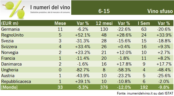 - Nel segmento dei vini sfusi prosegue il calo strutturale derivante dalla scarsa vendemmia del 2014, che potrebbe peraltro terminare se le recenti previsioni vendemmiali (47 milioni di ettolitri) dovessero essere effettivamente confermate. Il -10% sul semestre non è molto diverso dal -12% degli ultimi 12 mesi. Ormai i vini sfusi sono una categoria marginale del nostro export a valore dato che rappresentano il 7% del totale.