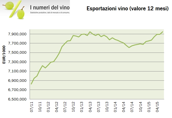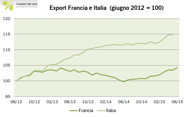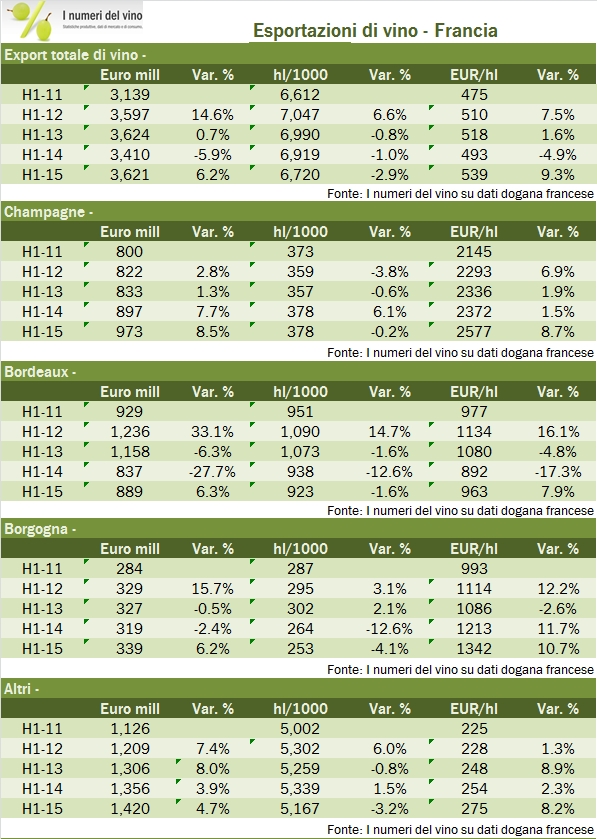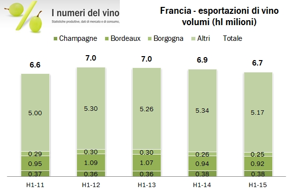 Sebbene manchino una decina di giorni all’annuncio delle esportazioni italiane nel primo semestre, quando guardiamo i dati della Francia resi pubblici qualche giorno fa ci accorgiamo che difficilmente potremo fare meglio, come è successo negli ultimi 2-3 anni. Infatti, le esportazioni di vino transalpine stanno recuperando piuttosto velocemente il terreno perduto negli ultimi tre anni, causato principalmente dal forte calo dei prezzi medi di export dei vini di Bordeaux. Nei primi 6 mesi dell’anno le esportazioni sono cresciute del 6% a 3.6 miliardi di euro (7.95 miliardi di euro sui 12 mesi, toccando il precedente picco), nonostante un calo del 3% dei volumi a 6.7 milioni di ettolitri. A titolo di confronto, per i primi 5 mesi del 2015, le esportazioni italiane sono a +5%, con un -2.4% di volumi e +8% in termini di prezzo medio. A guidare il recupero delle esportazioni francesi continua a essere il trend molto sostenuto delle esportazioni di Champagne (+8%), ma a fare la differenza rispetto agli ultimi due anni sono proprio i vini di Bordeaux che “si riprendono” un pezzettino del prezzo medio perduto (8% rispetto a una perdita di oltre il 20%), oltre naturalmente all’euro debole. Andiamo a vedere i numeri insieme, dandovi poi appuntamento al 13 settembre per il commento delle esportazioni italiane.