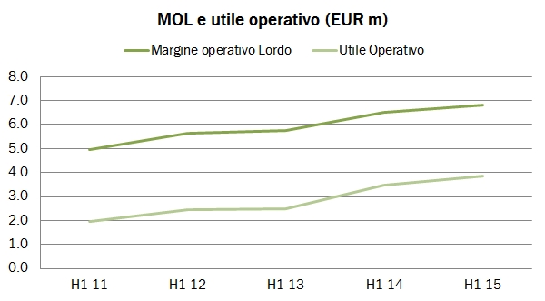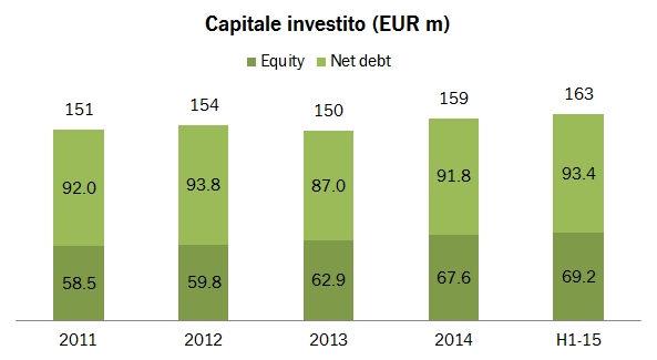 - L’azienda continua a investire. A fronte di una generazione di cassa di 5.4 milioni di euro (incluso un leggero beneficio dal capitale circolante) gli investimenti sono stati 6 milioni di euro nel semestre (contro 3 dello scorso anno nel medesimo periodo). Ne consegue un debito stabile rispetto a giugno 2014 a 93 milioni, in leggero incremento rispetto a fine 2014. Il rapporto debito/MOL di 6.1 volte resta molto elevato.