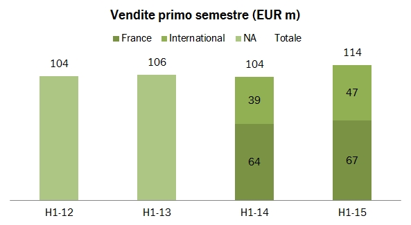 - Le vendite semestrali sono cresciute del 10% a 114 milioni di euro. Il fatturato è trascinato dalla crescita estera, +17% a 47 milioni, mentre le vendite in Francia sono in crescita del 4/5% a 67 milioni interamente grazie alla distribuzione tradizionale (ristorazione, enoteche e distributori all’ingrosso, a +14%).