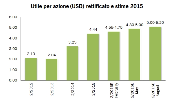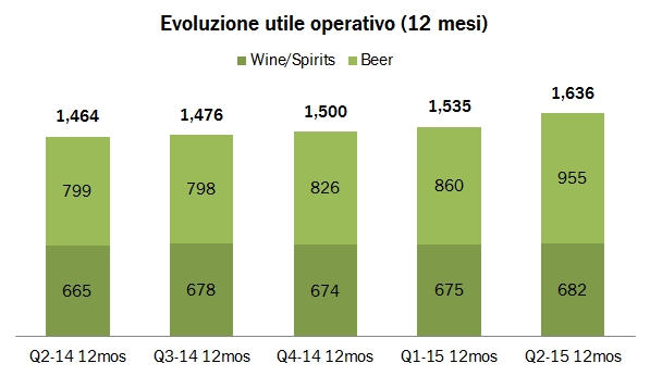 Il secondo trimestre di Constellation Brands ripete in pieno il copione del primo: la birra è protagonista della crescita degli utili, il management decide per la terza volta in 6 mesi di incrementare le attese di utili per l’anno fiscale 2015/16. Il grafico con l’evoluzione dell’utile operativo calcolato sui 12 mesi è un po’ il riassunto del messaggio che deve passare: Constellation Brands è partita un anno fa come un 55/45 birra/vino, oggi siamo vicini a un 60/40 ed è immaginabile che nel futuro la barra si sposti ancora di più alla luce del gigantesco investimento nel nuovo birrificio e nella produzione di vetro. E il vino? Le vendite di vino e spirits vanno abbastanza bene, +3% in termini organici (annullati dall’andamento dei cambi), i margini sono in leggera ma continua crescita, soprattutto grazie al segmento spirits. Nel secondo trimestre è stata completata l’acquisizione di Meiomi, che quindi contribuirà a partire dal terzo trimestre. Dicevamo di un ulteriore incremento delle attese di utili. Siamo partiti con una stima di 4.55-4.75, siamo ora a 5.00-5.20, quindi un incremento del 10% delle attese originarie, soprattutto grazie al segmento della birra. Passiamo ad analizzare i numeri.