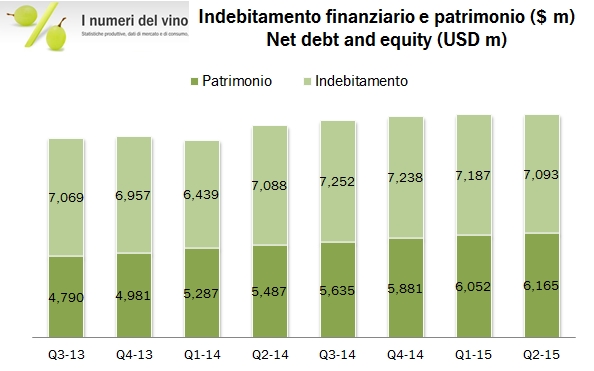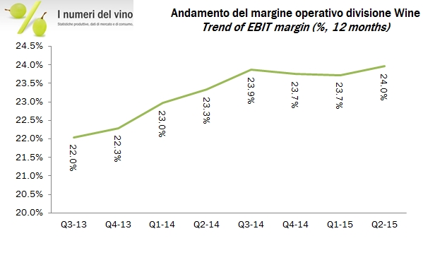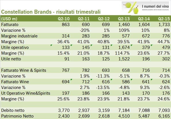 - CB ha fatturato 1.73 miliardi di dollari nel secondo trimestre, di cui 1 miliardo nella birra, +15%, 90 milioni negli spirits, +20% e 624 milioni nel segmento vino, -0.3% (di cui +3% crescita organica, a sua volta spaccata in +1.2% volumi e +2% prezzo/mix). se sommiamo i quattro ultimi trimestri ormai CB è diventato un colosso da 6.2 miliardi di fatturato, con un’esposizione al vino per circa 2.4 miliardi di euro.