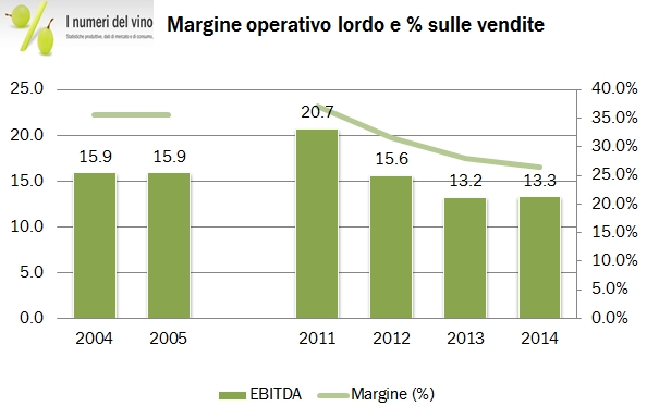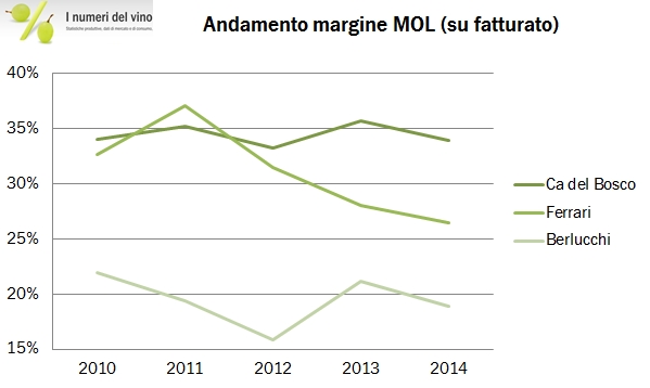 Resta il leader del metodo classico italiano, anche se dal confronto con Berlucchi e Ca del Bosco (ultimo grafico) emerge chiaramente come l’azienda gestita da Santa Margherita abbia nel corso degli ultimi anni “scavato” un fosso, sia in termini di crescita delle vendite (pur rimanendo più piccolina) che in termini di profittabilità.