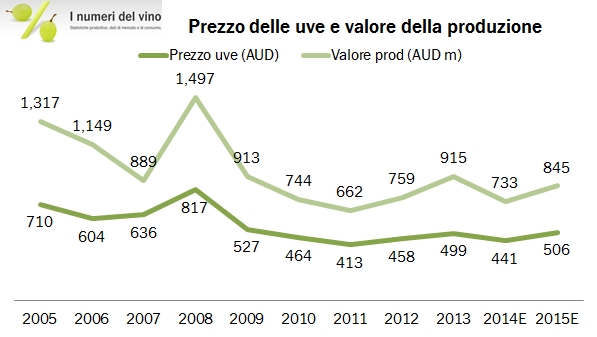 - Venendo alle questioni più “economiche”, il prezzo delle uve sale a 506 dollari australiani per tonnellata, il medesimo livello del 2013. Nella tabella sono nascosti i valori ma come potete carpire dal grafico, molte scelte produttive sono state fatte con prezzi delle uve tra 600 e 800 dollari a tonnellata. Da ciò le lamentele dell’associazione circa le perdite nelle quali continuano a incorrere i produttori di uve che rappresentano l’85% del prodotto totale, cioè la bellezza di 10 milioni di ettolitri di vino…