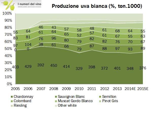 - Strutturalmente sembrerebbe di rilevare un graduale spostamento verso i vini bianchi, tendenza comune anche ad altre nazioni produttrici. Nel 2015, si prevedono 834mila tonnellate di uve bianche, +5% rispetto allo scorso anno e +1.5% rispetto alla media storica, mentre per l’uva rossa la produzione è attesa calante, -3.5% a 836mila tonnellate, il 3% sotto la media storica.