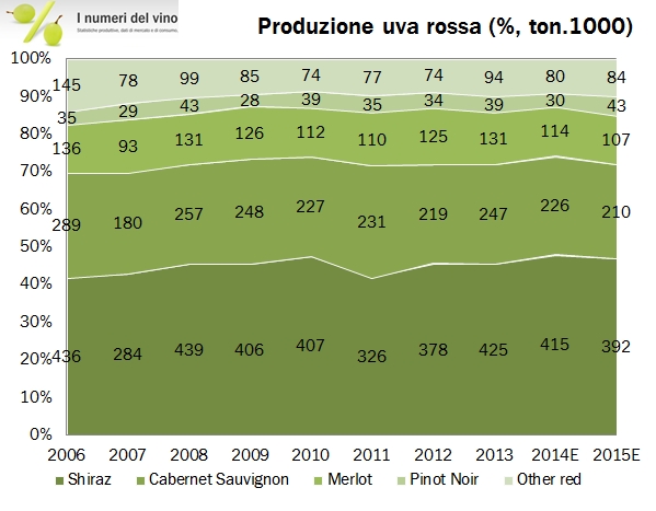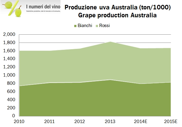- Secondo il sondaggio WFA si sono prodotti in Australia 1.67 milioni di tonnellate di uva. Il valore è perfettamente allineato a quello del 2014 e alla produzione media degli ultimi 5-6 anni.