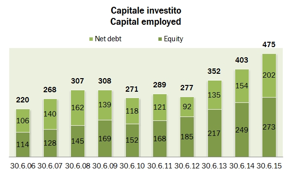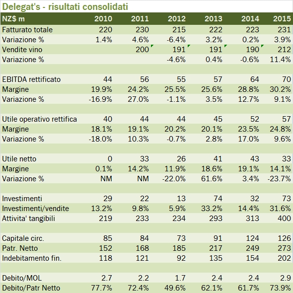 - Il debito è di conseguenza in risalita, 202 milioni nel 2015, con un rapporto di 3 volte sul MOL. Il capitale investito sale a 475 milioni di dollari (da 400 dello scorso anno) che determinano una diluzione del ritorno sul capitale (medio) dal 18% al 12%. E il prossimo anno si continuerà in questa direzione. Ma la bellezza di Delegat è che l’azienda non guarda un anno avanti, guarda cinque anni avanti: il modo migliore per creare valore vero per i suoi azionisti.
