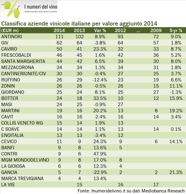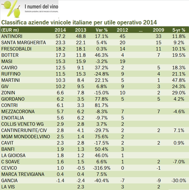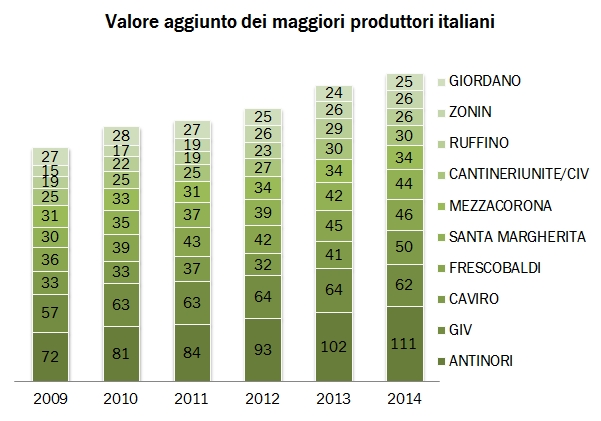 • Abbiamo detto di Antinori e dell’andamento “globale” di queste 25 aziende. La “seconda forza” del settore resta GIV, che però ha subito un calo del valore aggiunto del 4% (ma ha leggermente migliorato l’utile operativo) a 62 milioni, molto lontano dai 111 milioni di Antinori. Nel 2009 la distanza tra i due produttori era di 15 milioni di euro, da 72 a 57 milioni. Con i dati 2014 sfiora i 50 milioni di euro. Un’enormità per due aziende nello stesso settore e della medesima taglia.