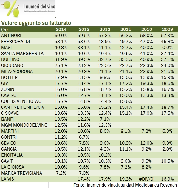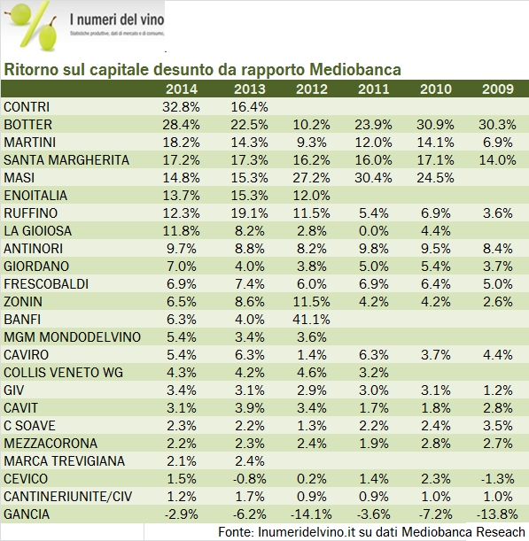 Eccoci al secondo appuntamento con i dati 2014 dei maggiori produttori italiani. Oggi guardiamo a quanti soldi fanno e a quanto rende i loro capitale. Possiamo dire, anticipando anche quello che uscirà ad aprile in termini di dati cumulati, che il 2014 per le grandi aziende vinicole è stato un ottimo anno. Se è vero che il fatturato di questo campione di 25 aziende è cresciuto in maniera marginale (+1%) i margini sono migliorati circa alla stessa velocità dell’anno scorso. Per questo campione, il valore aggiunto è cresciuto del 6%, passando dal 19.6% al 20.5% del fatturato, mentre l’utile operativo è cresciuto del 12% circa, passando dal 6.5% al 7.2%. Il campione di utili resta Antinori, che come abbiamo commentato qualche settimana fa ha avuto un ottimo anno, con un progresso del valore aggiunto del 9% e dell’utile operativo del 17%. Antinori si conferma anche il produttore italiano (tra i grandi) più profittevole, con un margine del 30% del fatturato, precedendo Masi (finalmente incluso da Medioabanca!), Santa Margherita, Frescobaldi e Ruffino. Il tema del ritorno sul capitale è come sapete più subdolo, dato che premia le aziende con pochi investimenti, come gli imbottigliatori, che in questa fase del mercato (con prezzi delle materie prime in calo) sono riusciti a superare il 20% o addirittura il 30% (su capitali investiti molto limitati).