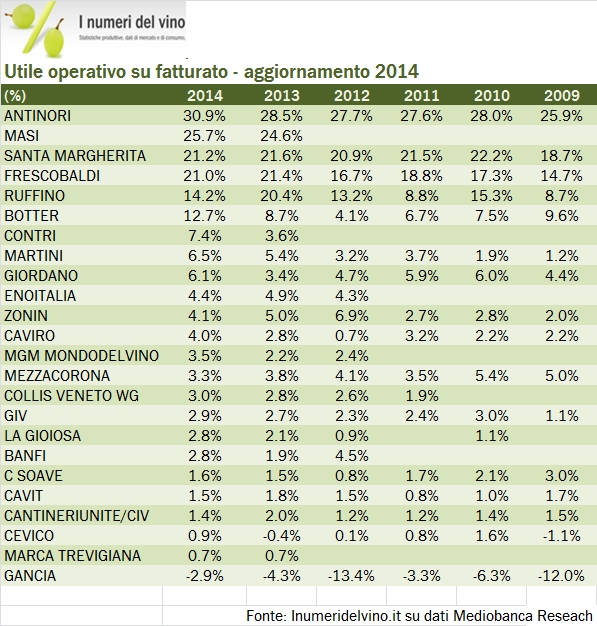 Utili e margini delle principali aziende vinicole – 2014 dati MBRes