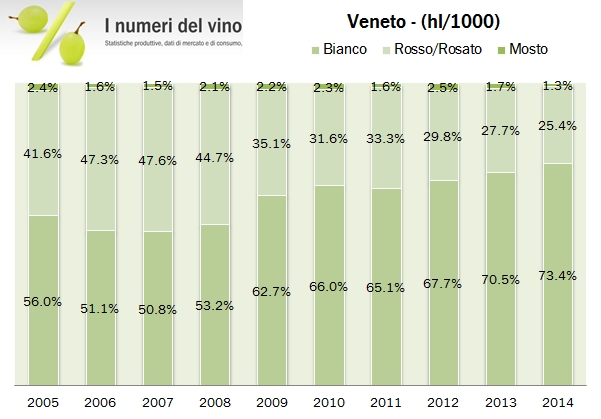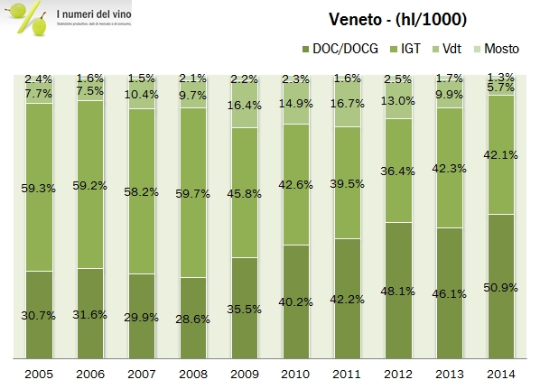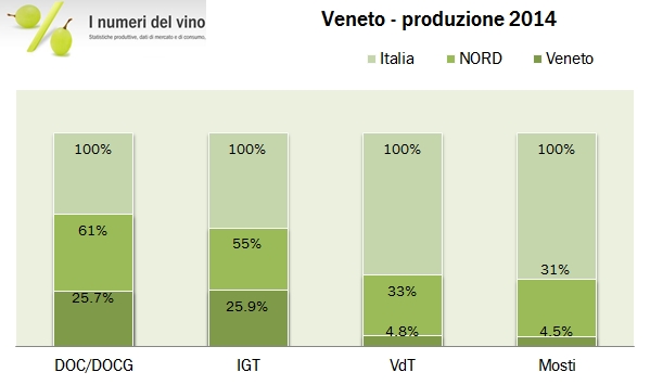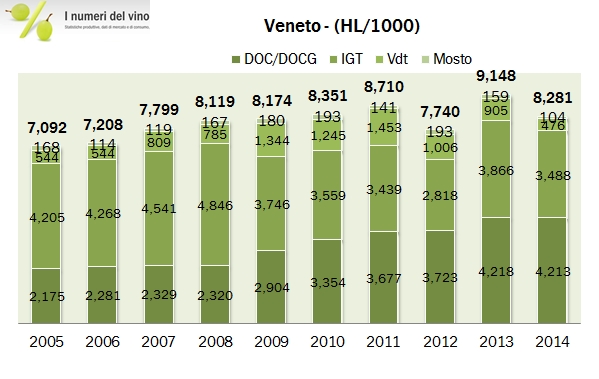 La produzione di vino in Veneto nel 2014 è calata del 9% ma si è attestata su un livello allineato con la media degli ultimi 5 anni, cioè circa 8.2 milioni di ettolitri. E’ andata decisamene meglio che nel resto del paese, dove la produzione 2014 è del 6% circa al di sotto della media storica. Il dato è particolarmente importante per la rilevanza della regione: in Veneto si producono circa un quarto dei vini di qualità italiani, sia DOC che IGT e la propensione all’esportazione è molto spiccata, considerando la presenza del Prosecco ma anche di realtà aziendali di dimensione significativa. La produzione, in termini quantitativi, muove sempre di più verso i vini bianchi e verso i vini di qualità. Passiamo dunque ad analizzare i dati in dettaglio.