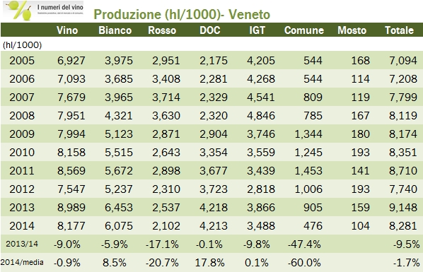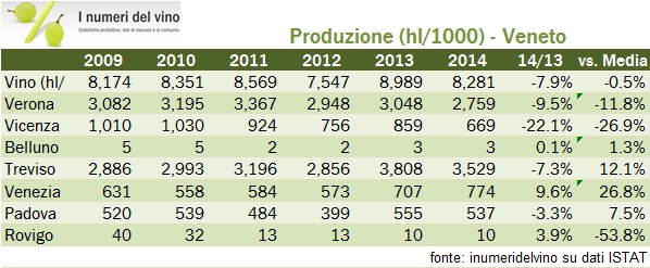 Scendendo al dettaglio per provincia, la produzione cala del 7% nella provincia chiave, Treviso, con 3.5 milioni di ettolitri, mentre a Verona, dove i vini rossi sono più importanti, la produzione è scesa del 10% a 2.8 milioni di ettolitri. Venezia vede invece crescere la produzione del 10% a 0.8 milioni di ettolitri, mentre l’annata 2014 è stata molto negativa a Vicenza, che cala del 22% a 0.7 milioni di ettolitri.
