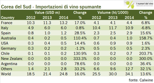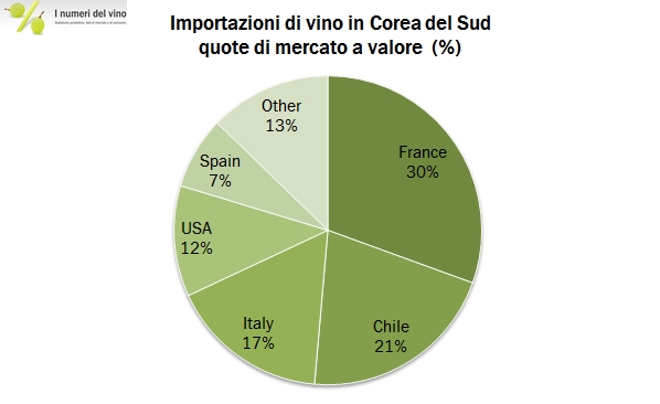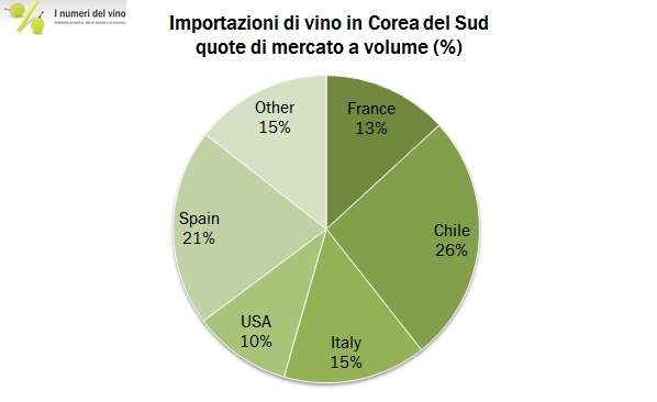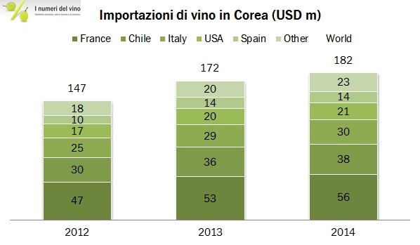 La Corea del Sud è la quarta potenza economica asiatica, con 50 milioni di abitanti. Nel settore del lusso è un importante mercato per diverse aziende italiane e un paio di operatori coreani sono tra i leader mondiali nel segmento del duty free. Anche il vino sta diventando un prodotto importante nel paese, naturalmente si tratta di prodotto interamente importato. Grazie alla yearly review di Calwine analizziamo oggi le importazioni di vino fino al 2014, che hanno raggiunto un livello piuttosto ragguardevole non tanto in volume (330mila ettolitri), quanto a valore (182 milioni di dollari). Di più, secondo questi dati (ma anche guardando all’evidenza del mercato del lusso), il mercato coreano non ha mostrato i segnali di cedimento che abbiamo appena commentato guardando a mercati vicini come Hong Kong: l’andamento 2014 è rimasto positivo (+6% in valore e +2% in volume), dopo un triennio 2010-2013 in cui erano cresciute al ritmo del 15% annuo. L’Italia in questo contesto è messa un po’ meglio che negli altri mercati della zona: siamo il terzo esportatore, dopo la scontata Francia e il Cile. Andiamo a leggere qualche numero insieme.
