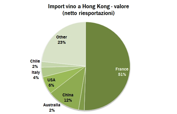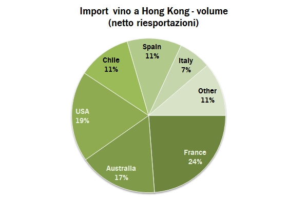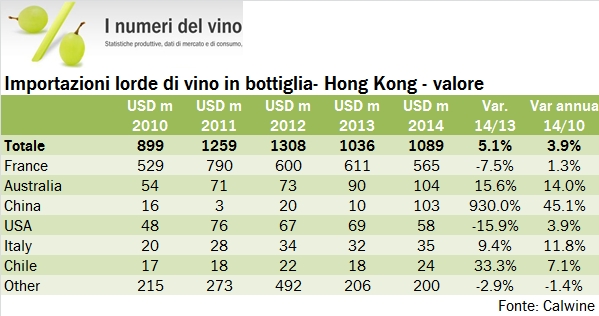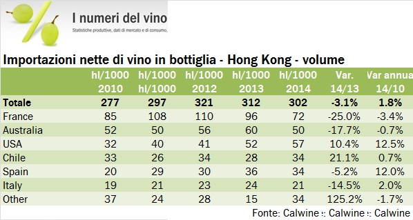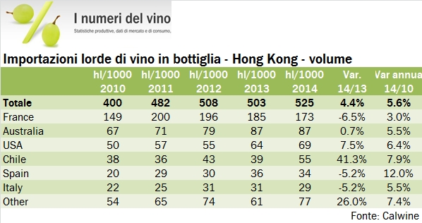 - Nel 2014 Hong Kong ha importato 525mila ettolitri di vino, +4.4% rispetto al 2013 e al massimo storico. Nettando le riesportazioni, l’import scende a 300mila ettolitri e mostra invece un calo del 3% rispetto allo scorso anno, che a sua volta era sceso rispetto al picco del 2012 (321mila ettolitri).