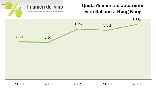 Hong Kong sta diventando un “osservato speciale” nel mondo dei beni di lusso. Come dice un simpatico manager di Tod’s: “Hong Kong si è trasformata da un mercato a una città”. In altre parole, se prima le aziende consideravano Hong Kong allo stesso livello di una nazione, come la Francia o la Danimarca, oggi ha perso questo status a causa del forte calo del flusso di “turisti per shopping” dalla Cina. Questa dinamica ha cominciato ad impattare anche il settore del vino, come possiamo vedere dai dati publicati recentemente da Calwine e da noi rielaborati. Le elaborazioni che analizziamo oggi sono leggermente diverse da quelle precendenti sul blog (qui), perchè questi sono dati riferiti al vino totale e non soltanto al vino in bottiglia. Quindi se li confrontate trovate numeri, a parità di anno, leggermente superiori in questa serie di dati rispetto all’altra. Detto questo, cosa dicono i dati? Beh, che nel segmento del vino il boom fu nel 2011 e non nel 2013, ma che il 2014 le cose sono comunque peggiorate, con un calo delle importazioni di vino (nette delle riesportazioni in Cina) del 7% in dollari americani e del 3% in volume. In questo contesto, fa la sua prima apparizione il vino cinese (oppure estero ma importato dalla Cina), che diventa immediatamente la seconda forza nel mercato locale. L’Italia resta marginale, con un peso del 7% dei volumi e del 4% del valore, anche se va detto che l’andamento della “quota di mercato apparente” è stato costantemente positivo negli ultimi anni. Andiamo a leggere i numeri insieme.