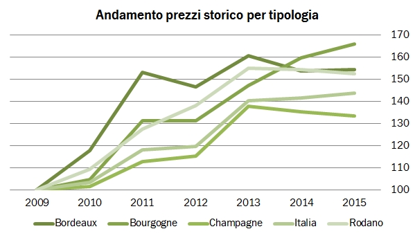 - I vini di Bordeaux sono sempre 54 e il prezzo medio è stabile (+0.5%), circa il 55% sopra il 2009. I vini borgognoni passano da 16 a 19, con un prezzo medio per cassa di 2400 sterline, +4% sul 2014 e il 66% sopra il 2009. I vini della Champagne passano da 7 a 6 e il loro prezzo cala dell’1.3%, il 34% sopra il 2009. I vini italiani come dicevamo calano dal 10 a 7, con un prezzo medio per cassa di 1255 euro, un prezzo in crescita dell’1.6% e del 44% superiore al 2009. Ci sono poi in classifica cinque marchi del Rodano (erano 6) tre australiani (come nel 2014), tre americani (erano due), due spagnoli e un argentino.