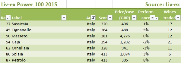 - Come dicevamo i vini italiani peggiorano in classifica. Il primo è ancora Sassicaia, che però figura al numero 27 (contro il numero tre dello scorso anno), poi Tignalello al 45esimo (76esimo nel 2014), Masseto al 50esimo (25esimo nel 2014), Gaja al 54esimo (14esimo), Ornellaia al 62esimo (13esimo), Solaia all’86esimo (62esimo) e Petrolo all’87esimo, unica new entry.