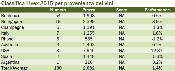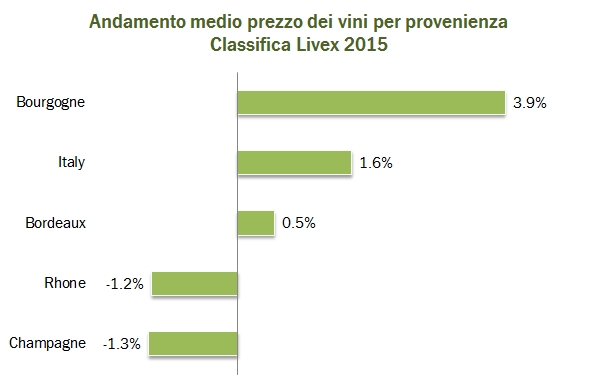 Quindi, quest’anno i vini italiani in classifica sono soltanto sette, mentre erano dieci lo scorso anno. Tutti quelli ancora preenti salvo uno (Tignanello) peggiorano in classifica, mentre escono Giacomo Conterno e Bruno Giacosa (che essendo tra i più buoni secondo i critici hanno perduto un componente importante del loro punteggio), oltre a Guado al Tasso (già ai margini della classifica nel 2014) e Macchiole. Il top secondo Liv-Ex è Mouton Rothschild, che prende lo scettro da Pavie. I prezzi continuano invece a cresce per i vini borgognoni e italiani, mentre sia il Rodano che la Champagne calano leggermente, dopo il grande balzo del 2013. Andiamo a leggere qualche dato insieme.
