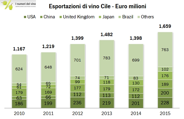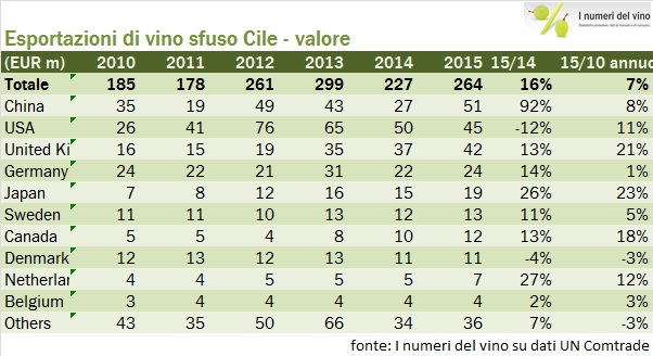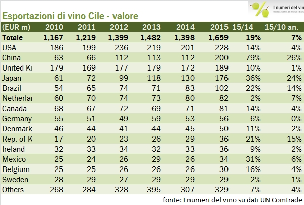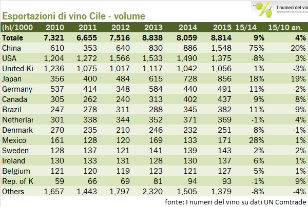 Anche nel 2015 le esportazioni di vino cileno sono cresciute. Anzi, l’anno appena concluso è stato anche migliore del 2014, soprattutto se si traducono i dati nella loro valuta locale, il peso: ne risulta un incremento del 14% in valuta locale, contro il +9% registrato nel 2014. Da quest’anno questo post cambia fonte, essendo passato dui dati di UN Comtrade Database, e soprattutto ho deciso di cambiare valuta, trasformando tutto in euro, perchè alla fine il 95% di chi legge ha in testa gli euro e gli viene più semplice leggere euro che non dollari o ancora più incomprensibili peso cileni. Dicevamo che è un buon anno per il Cile, sia dal punto di vista dei numeri totali (+19% a valore in euro a 1.7 miliardi di euro e +9% a volume a 8.8 milioni di ettolitri) che dal punto di vista del mix, dato che come lo scorso anno la crescita resta più spostata nel segmento dei vini imbottigliati (almeno a valore). Ma lo è anche perchè il prodotto cileno si è aperto nuove strade per continuare a crescere. Lo dicevamo già lo scorso anno che i nuovi mercati stavano diventando importanti. Nel 2015 la Cina è a tutti gli effetti il secondo mercato di esportazione con 200 milioni di euro 1.5 milioni di ettolitri spediti superando di slancio Regno Unito e Giappone, dove comunque le esportazioni in euro sono cresciute del 10% e del 26% rispettivamente. Questa capacità di aggredire nuovi mercati è un fattore molto positivo, anche se non ci sono soltanto buone notizie: il prodotto cileno sembra più esposto alla competizione di quello dei concorrenti in alcuni mercati storici, come gli USA o il Regno Unito, dove le esportazioni negli ultimi anni sono state molto altalenanti. Andiamo a leggere i numeri insieme.