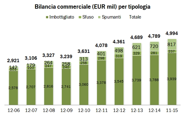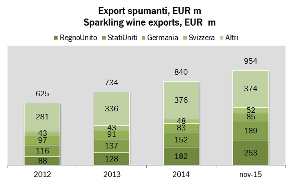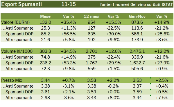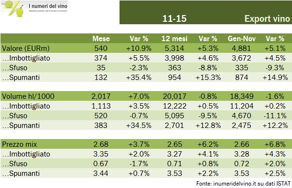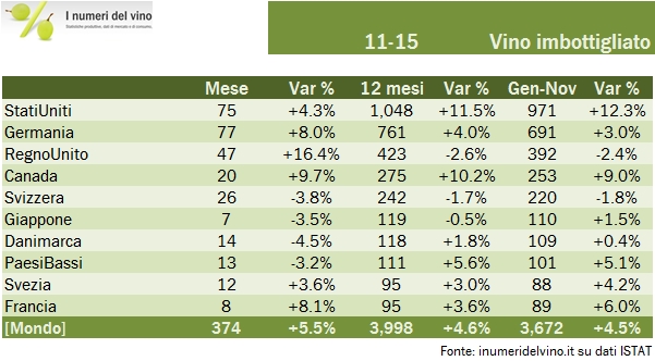 Novembre e’ stato un ottimo mese per le esportazioni di vino, in totale controtendenza con quanto era successo nei due mesi precedenti. Con un incremento dell’11% del fatturato, l’andamento da inizio anno e’ migliorato dal 4% al 5%, per un valore che probabilmente sara’ leggermente sopra 5.3 miliardi di euro a fine anno (dati pubblicati l’11 marzo). Il risultato e’ soprattutto legato al balzo dei vini spumanti, +35%, che “recuperano” il terreno perso nei due mesi precedenti, ma non si tratta solo di questo: ci sono segnali di stabilizzazione per i vini sfusi, calati solo del 2% a Novembre e i vini imbottigliati sono cresciuti del 5%. Quando si parla di ottima performance degli spumanti si pensa subito al mercato inglese, che infatti e’ cresciuto in novembre del 30%, portando a +12% l’andamento da inizio anno, mentre le esportazioni degli USA nel mese sono state in crescita del 10% circa. Continua il calo in Russia e si acuisce il calo in Brasile (peraltro poco rilevante), mentre dei chiari segnali di accelerazione si stanno materializzando in Cina (+25% nel mese e +20% da inizio anno). Andiamo a leggere qualche dato insieme.