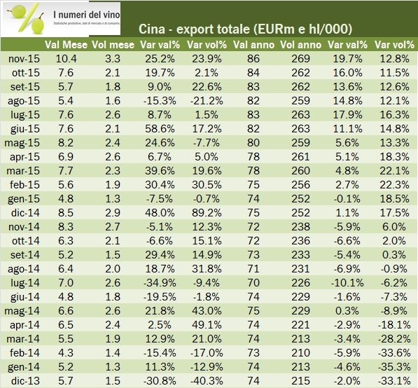 - Infine una parola sulla Cina. Le esportazioni sono a quota 86 milioni di euro, +20% rispetto a un anno fa. Vero che c’e’ un impatto cambio rilevante (+17% media 2015) ma certamente i dati degli ultimi mesi sono molto incoraggianti anche sui volumi (+13% a 270mila ettolitri). Se anche gli spumanti cominciassero a girare (+1% a 12 milioni)…