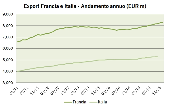 Visto lo strutturale indebolimento dell’euro del 2015 potremmo dire che la Francia ha saputo capitalizzare lo scenario valutario, avendo realizzato un vero e proprio boom di esportazioni sul mercato americano (+24% da 1.07 miliardi a 1.33 miliardi di euro). La spiegazione più plausibile credo sia da ricercare nel “pricing power” del prodotto francese, che ha marchi e organizzazioni commerciali più forti delle nostre. Mi viene in mente, tanto per dire, che 2 di questi 8 miliardi di esportazioni sono effettuate da una sola azienda, LVMH…