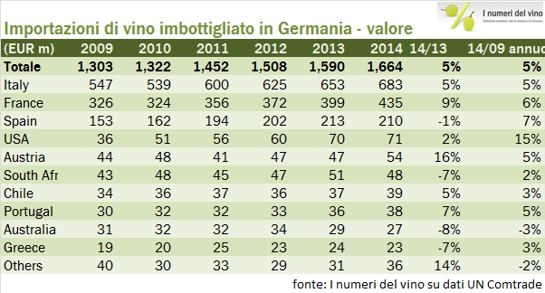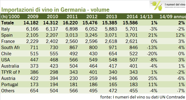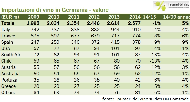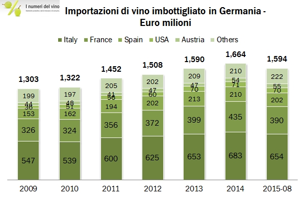 - La Germania ha importato nel 2014 vino per quasi 2.6 miliardi di euro, in calo dell’1% sul 2013. Ad agosto 2015, le importazioni erano 100 milioni più basse, poco meno di 2.5 miliardi. Se confrontate con il fine 2014 siamo giù del 4.5%.