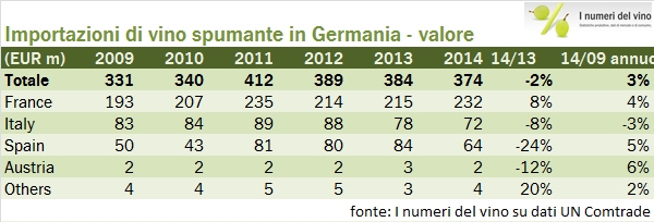 - Passando per un chiudere ai vini spumanti, il commercio estero tedesco è dominato dai francesi che nel 2014 hanno guadagnato quota di mercato. Su 374 milioni di euro di spumanti importati, il 62% sono francesi, il livello più elevato di sempre mentre per l’Italia (e per la Spagna) sono dolori: le esportazioni sono calate rispettivamente dell’8% e del 24% circa.