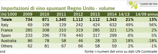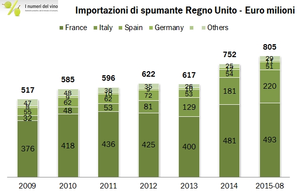 Dopo il post sulle importazioni tedesche, il secondo mercato importante per l’Italia sul quale abbiamo sempre avuto qualche problema di lettura è certamente il Regno Unito. Con 3.8 miliardi di euro di importazioni di vino e 14.5 milioni di ettolitri importati nel 2014 è uno dei più ricettivi. Non solo: la forza della sterlina nei confronti dell’euro e il buon andamento dell’economia locale lo rendono anche un mercato in accelerazione rispetto al passato, con una crescita di circa il 4-5% nel corso del 2015 (fino a agosto), rispetto al +2% annuo mostrato negli ultimi anni. E’ anche un mercato dove l’Italia è riuscita a crearsi uno spazio importante, sia guadagnando quote di mercato nel segmento dei vini fermi imbottigliati, sia contraddistinguendosi nel segmento degli spumanti, come sappiamo bene quando guardiamo i dati relativi alle nostre esportazioni. Nel 2014 l’Italia ha rappresentato il 18.6% delle importazioni inglesi di vino (19.1% nei 12 mesi terminanti a agosto), era sotto il 10% prima della crisi del 2009. E gli altri? Il dominio è francese, con un valore di export di 1.3 miliardi di euro contro i nostri 700 milioni, e con un andamento tutto sommato soddisfacente. Negli ultimi anni, gli inglesi hanno cambiato abitudini: invece di importare principalmente prodotti australiani (crollati miseramente) e in minor misura Sud Africani, hanno aperto i loro orizzonti all’Italia alla Spagna e alla Nuova Zelanda. Ma grazie ai vini spumanti l’Italia dal 2009 a questa parte ha fatto meglio di tutti gli altri. Andiamo a leggere qualche numero.