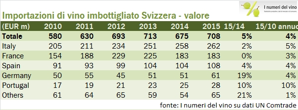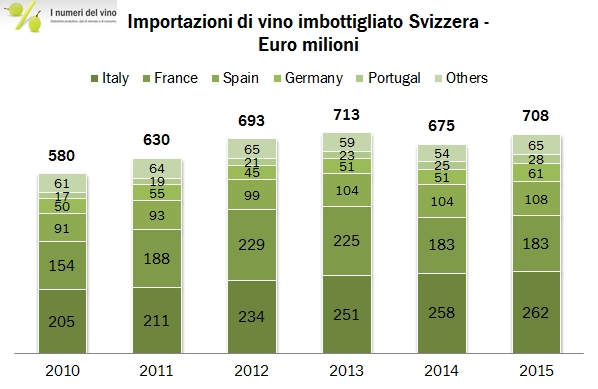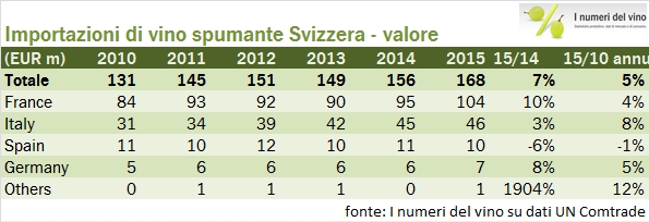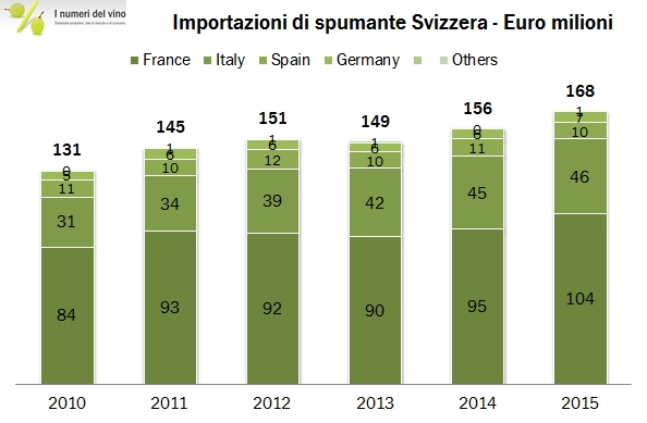 La Svizzera è il quarto mercato di esportazione di vino per l’Italia e quindi merita un occhio di riguardo, anche e soprattutto perchè si tratta di un mercato dove l’Italia ha costruito una posizione di leadership (ven visibile dal grafico qui sopra) a discapito della Francia. I dati 2015 appena rilasciati da UNComtrade (967 milioni di euro di importazioni, +5% in euro ma -7% in Franchi svizzeri, con un volume stabile a 1.9 milioni di ettolitri) indicano una leggera inversione di tendenza della nostra quota di mercato al 35.5%, quota che peraltro aveva raggiunto un picco di quasi il 37% nel 2014, quando il nostro prodotto aveva per la prima volta superato l’export Francese in Svizzera, storicamente leader di mercato. La situazione vede quindi l’Italia e la Francia spartirsi i due terzi del mercato e il resto del mondo accaparrarsi l’ultimo terzo. Tra questi, principalmente Spagna e Germania, a dimostrazione dell’impronta estremamente tradizionale dello stile di consumo di vino dei nostri vicini di casa. Nel segmento dei vini spumanti naturalmente la Francia guida con esportazioni doppie rispetto alle nostre, anche se il prodotto italiano negli ultimi anni (ma non nel 2015) è cresciuto di più. Andiamo a leggere qualche dato insieme.