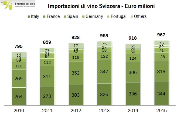 • La Svizzera ha importato vino per 967 milioni di euro, con un incremento del 5% rispetto al 2014 e una crescita negli ultimi 5 anni del 4% circa. In termini di volumi, ciò si traduce in 1.9 milioni di ettolitri, stabile sia rispetto al 2014 che guardando i numeri degli ultimi anni. Ne deriva quindi un prezzo medio di import di 5 euro al litro, un livello decisamente elevato rispetto agli standard del trade mondiale.