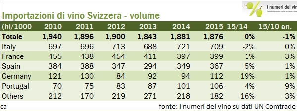 • I dati vanno però letti considerando l’andamento dei cambi. Nel 2014 ci volevano 1.21 franchi per comprare un euro, mentre nel 2015 ne sono bastati mediamente 1.07. Quindi, se prendiamo questi numeri e li trasformiamo, usciamo con dei dati un po’ meno positivi, in discesa da 1.11 miliardi di franchi a 1.03 miliardi, quindi -6.9%. Diciamo, salomonicamente, che gli svizzeri hanno comperato lo stesso vino del 2014 e lo hanno pagato un po’ di più, regalando agli esportatori parte del risparmio derivante dalla loro valuta forte.