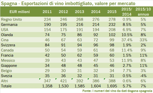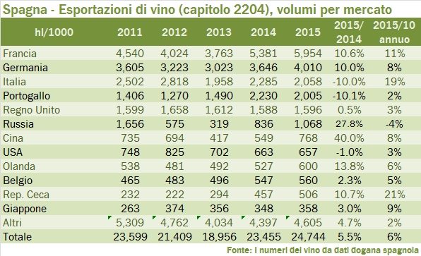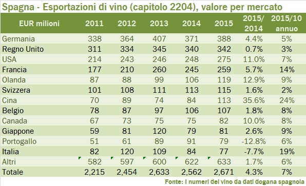 - La Spagna ha esportato vino per 2.67 miliardi di euro nel 2015, con un incremento del 4.3%, per un volume di 24.7 milioni di ettolitri, in crescita del 5.5%. L’andamento sugli ultimi 5 anni è molto positivo, +7% annuo, quasi completamente guidato dall’incremento dei volumi (+6%).